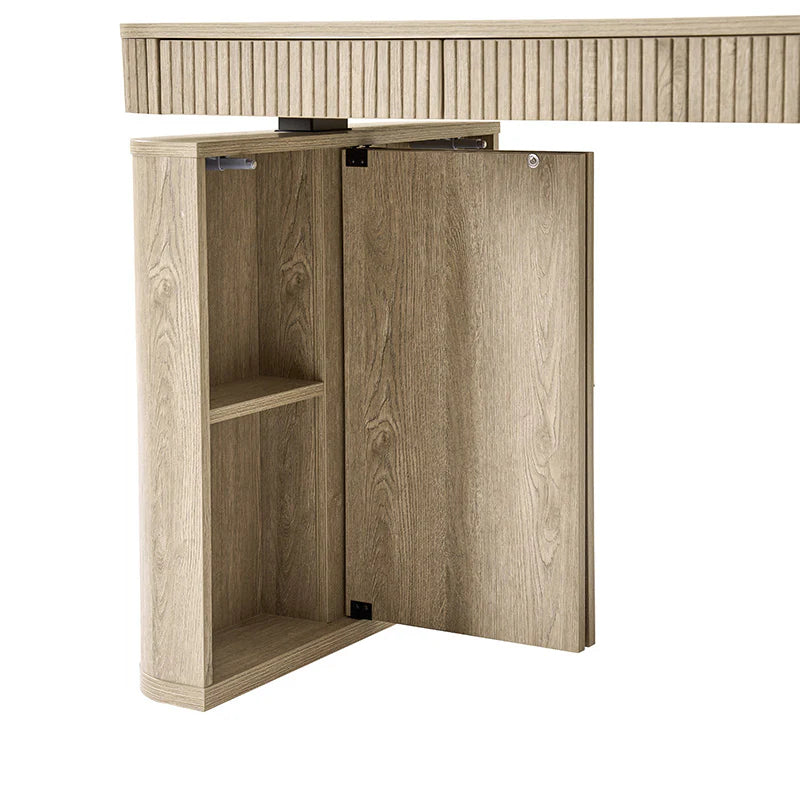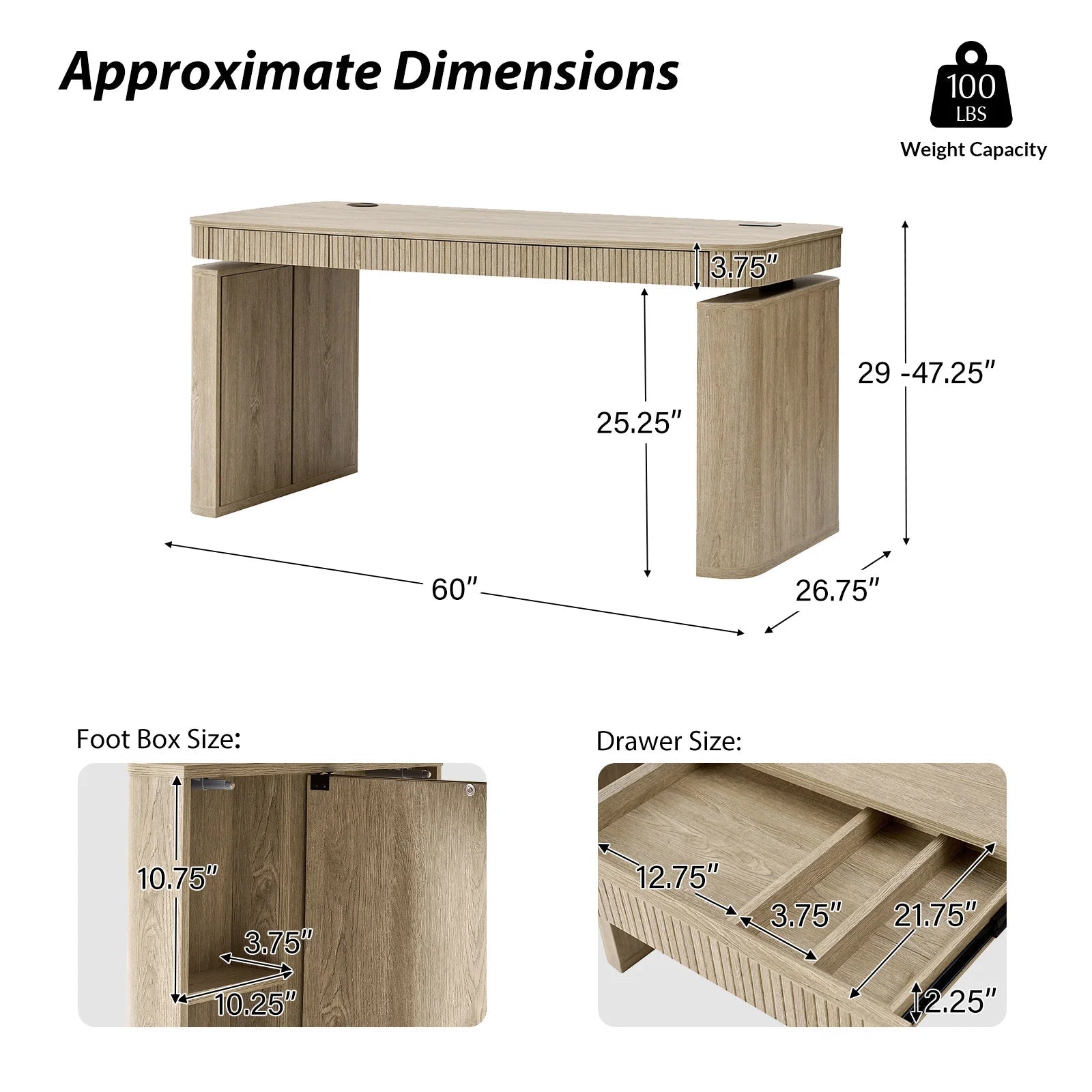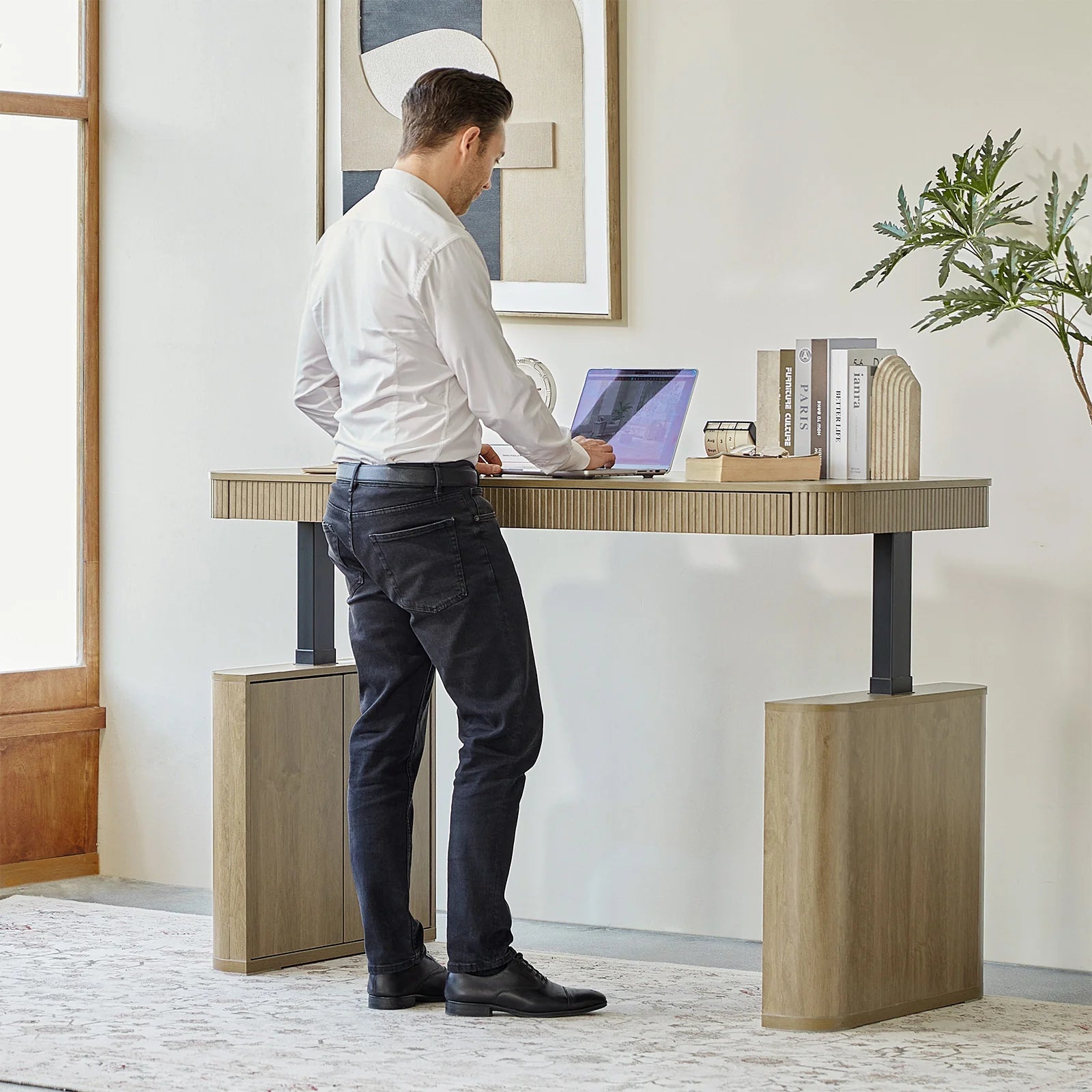 Il meccanismo elettrico di sollevamento della scrivania regolabile in altezza consente regolazioni fluide, permettendoti di passare senza sforzo dalla posizione seduta a quella in piedi per una routine di lavoro più sana. Con un elegante dettaglio a listelli, questa scrivania regolabile aggiunge un tocco sofisticato all'arredamento dell'ufficio. Le opzioni di stoccaggio sono abbondanti, con una mensola interna su entrambi i lati per riporre oggetti nascosti, completa di ante a battente con apertura a pressione per un facile accesso. Sotto il piano del tavolo, tre ampi cassetti offrono guide morbide e autoinciudibili, garantendo un utilizzo silenzioso e fluido. Mantieni il tuo spazio di lavoro organizzato con la gestione dei cavi integrata, progettata per nascondere in modo ordinato i cavi e mantenere una scrivania pulita e sistemata. Questa scrivania elettrica regolabile fonde estetica elegante con funzionalità moderna, rendendola la scelta perfetta per un ufficio domestico o un ambiente di lavoro contemporaneo.