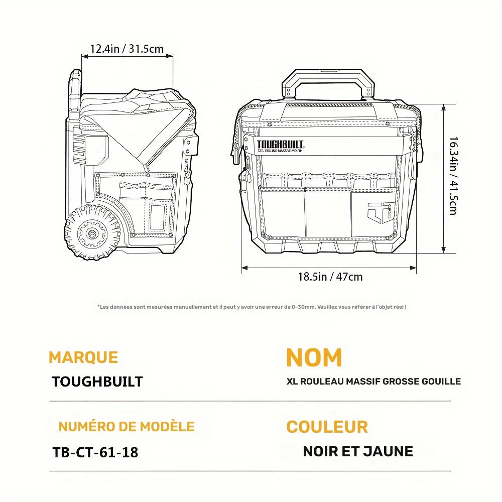 sac à outils roulant xl avec bouche massive - organisateur doutils en polyester non chargé, noir - tb-ct-61-18   batterie détails 12